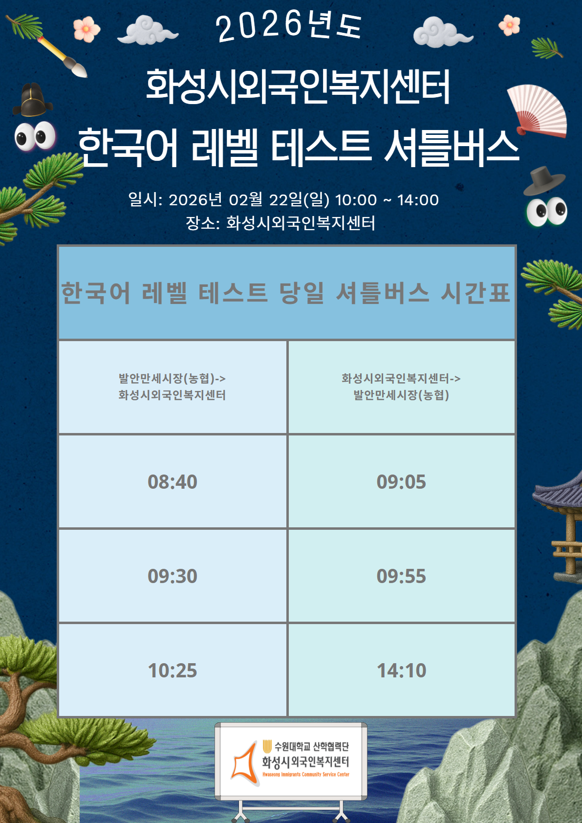 한국어교육(평일/주말), 외국인주민 한국생활적응교육, 한국어 대회 등